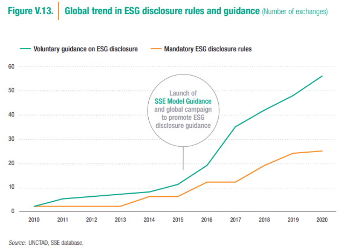 2015年に国内の上場企業の情報開示にも関わるコーポレートガバナンス・コードが導入され、その前年に機関投資家向けにスチュワードシップ・コードが導入された。失われた日本経済20年に対する日本再興戦略の一つとして、両コードが盛り込まれたが、その目的のひとつは、機関投資家と企業との対話を促進することで、日本企業のガバナンス取組強化による企業価値向上(ROEの向上など)、それに付随して海外資金の日本への呼び込みであった。両コードは、3年ごとに改訂され、直近では取締役会におけるサステナビリティ課題への対応と情報開示(特に気候変動対応に関するTCFD開示)の充実が求められている。これは、海外の取引所においてESG関連情報開示の強制適用が増えている事も影響している。