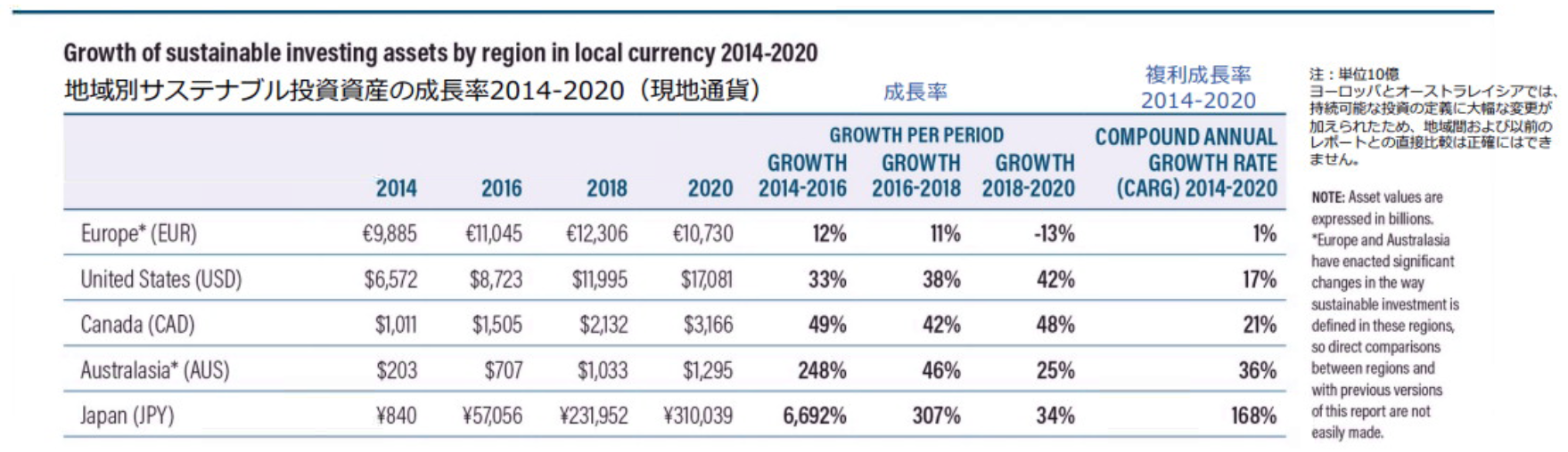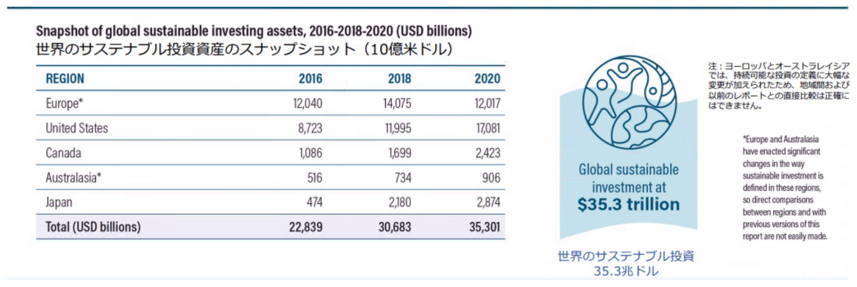 2013年から2年毎にGSIA(Global Sustainable Investment Alliance, 日本はJSIFが加盟)から公表されている報告書の最新版Global Sustainable Investment Review2020(2021年7月公表)によれば直近では投資残高は35.3兆ドルとなっている。