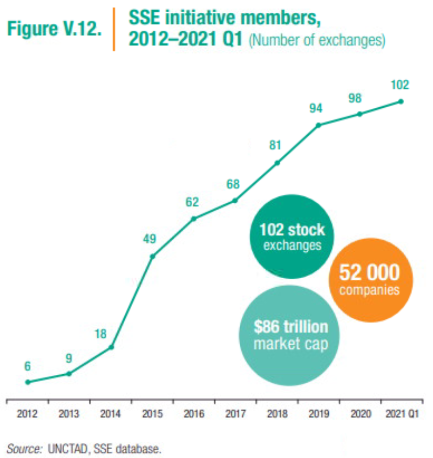 次のグラフは、SSE(Sustainable Stock Exchange ,サステナブル証券取引所)イニシアティブに賛同している取引所数の動向であり、日本において証券取引市場の再編が予定され、2022年4月からはTCFD開示が求められるプライム市場が誕生するのもこの流れと考えられる。