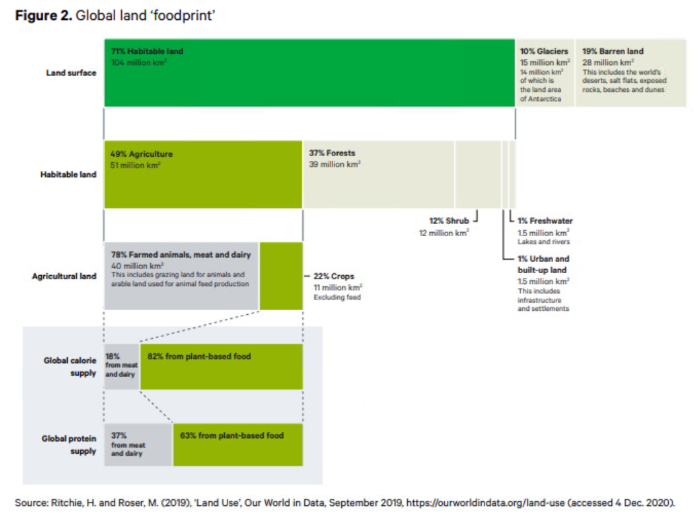 上記のグラフからは、地上の半分が農地利用され、生態系喪失の要因となっている事が示されている。 出典: https://www.chathamhouse.org/2021/02/food-system-impacts-biodiversity-loss