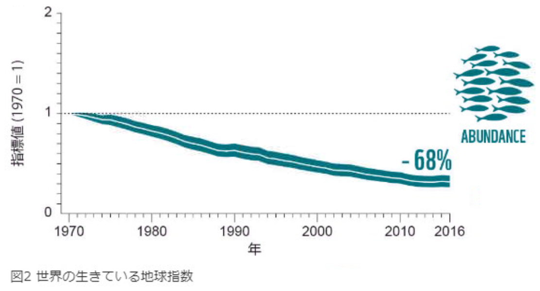SDGsウエディングケーキモデルにおいて人間の社会経済生活は生態系維持を基盤に成立していることが示されているが、プラネタリーバウンダリー理論によれば、気候危機以上に、生態系が既に危機的状況にあることが示されている。 生物多様性の現状について2020年WWFから出された報告書から抜粋、紹介する。 この報告書によれば下のグラフに示す様に過去50年で脊椎動物(哺乳類、鳥類、両生類、爬虫類、魚類)の個体数は68%減少している。