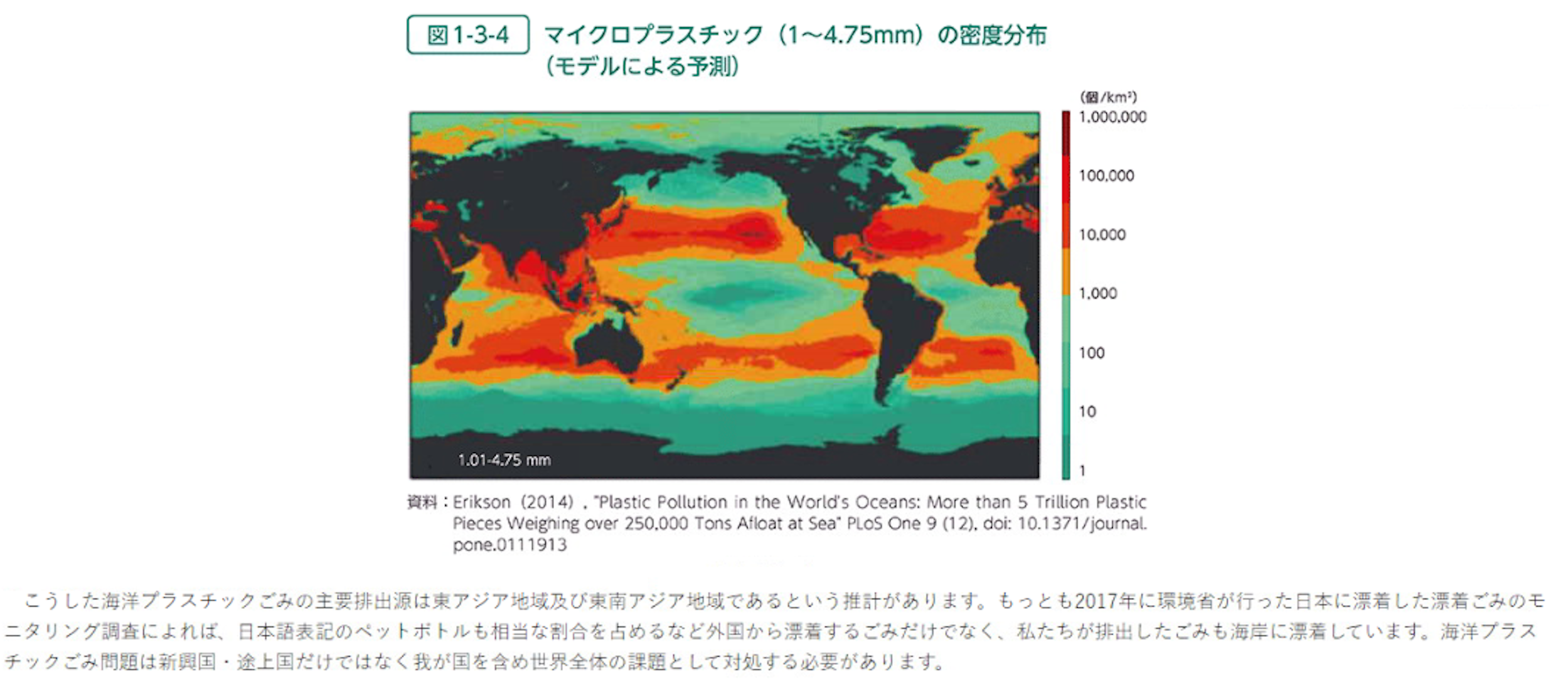 3R取組加速化の必要性 日本では、「大量生産・大量消費・大量廃棄」型経済社会から環境負荷が少ない「循環型社会」を形成することを目的に2000年6月に循環型社会形成推進基本法が公布された。これによりReduce/Reuse/ Recycleの頭文字をとった3Rの推進が掲げられてきたが、日常生活や経済社会において、相変わらず便利さや効率性が優先されてきた実態がある。 しかし、先に述べた生物多様性喪失の危機的状況が顕在化してきた今、改めてこの取り組みを真剣に進める必要性が高まっている。 中でも、便利なプラスチック利用とそれに伴う大量の廃棄物、またマイクロプラスチックによる海洋汚染は以下の図に示すように深刻な状況である。