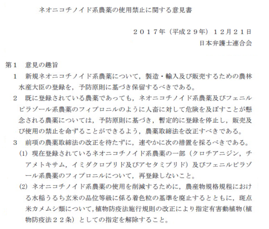 近年海外で使用禁止が広がっているネオニコチノイド系農薬により自然生態系への深刻な影響が出ていることは、世界的にベストセラーになった「ハチはなぜ大量死したのか」(日本語版2009年初版)にも著されている。国内利用は欧州と比べ緩やかな制限に留まっているが、これに関しては、自ら対策を講じ安全な食品を販売する生協があるほか日弁連からも提言が出されている。