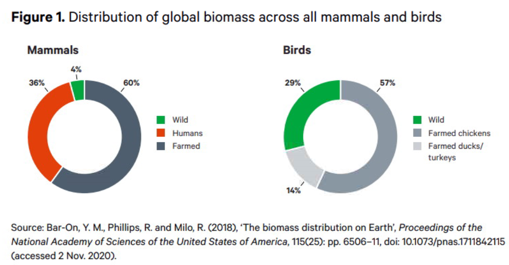 上記のグラフは、世界の哺乳類に占める人間の比率及び、鳥類全体に占める食糧用に飼育されている鳥類の比率である。