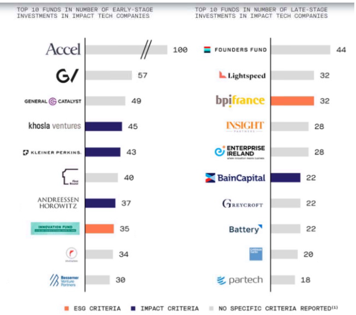 下の図は、気候関連に限らないが、テック企業に投資しているインパクト投資ファンドのトップ10である。投資に携わる人には馴染みのあるファンド名が並んでいる。運用機関の方針により、企業のアーリーステージに対して資金を出す会社と主にレートステージに資金の出し手となる会社が異なることが判るであろう。
