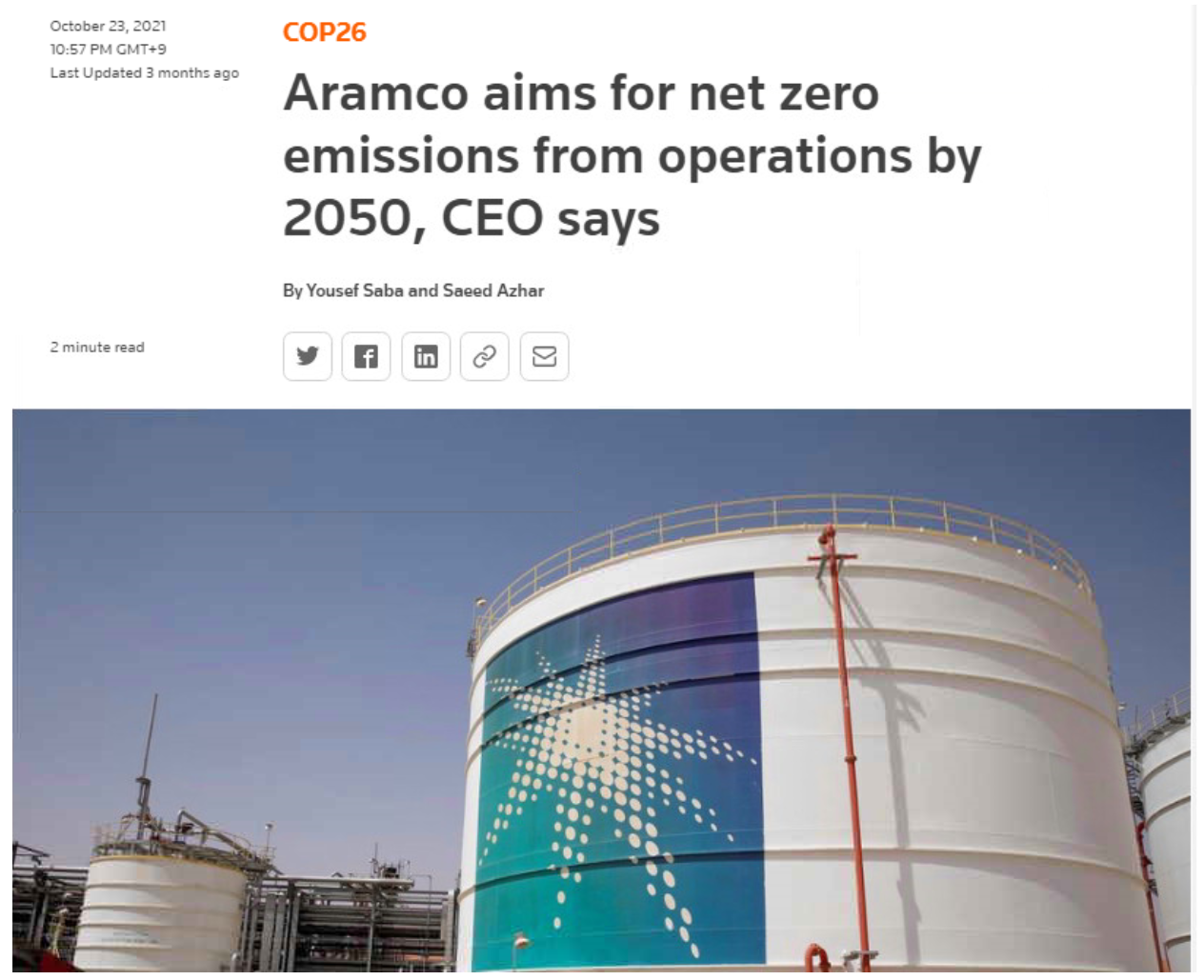 出典:https://www.reuters.com/business/cop/aramco-aims-net-zero-emissions-operations-by-2050-ceo-says-2021-10-23/