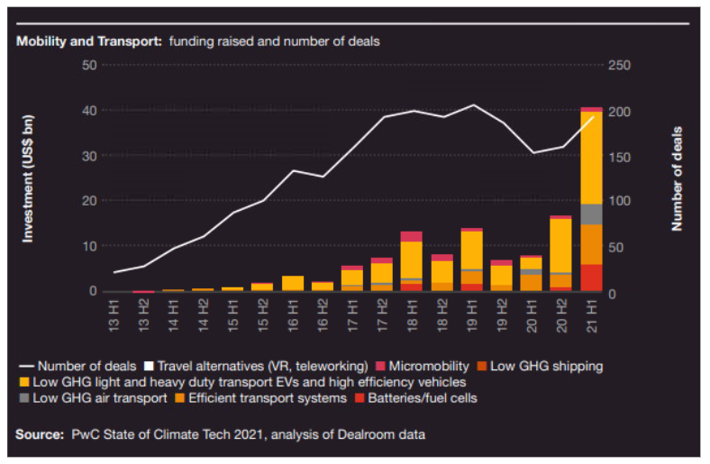 Climate Techの事業分野において下は輸送関連への投資に関するグラフであるが、大方の認識の通り急増しているが領域が広がっているのことも注視したい。