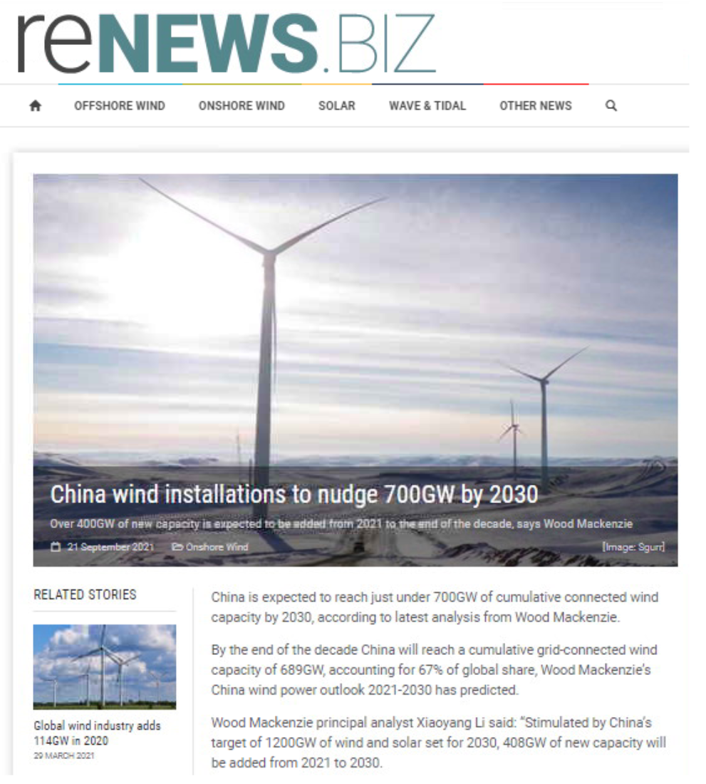 中国は2060年迄にカーボンネットゼロを公約しているが、それに向けて、昨年9月には2030年までに風力発電を700GWまでに拡大することを公表している。