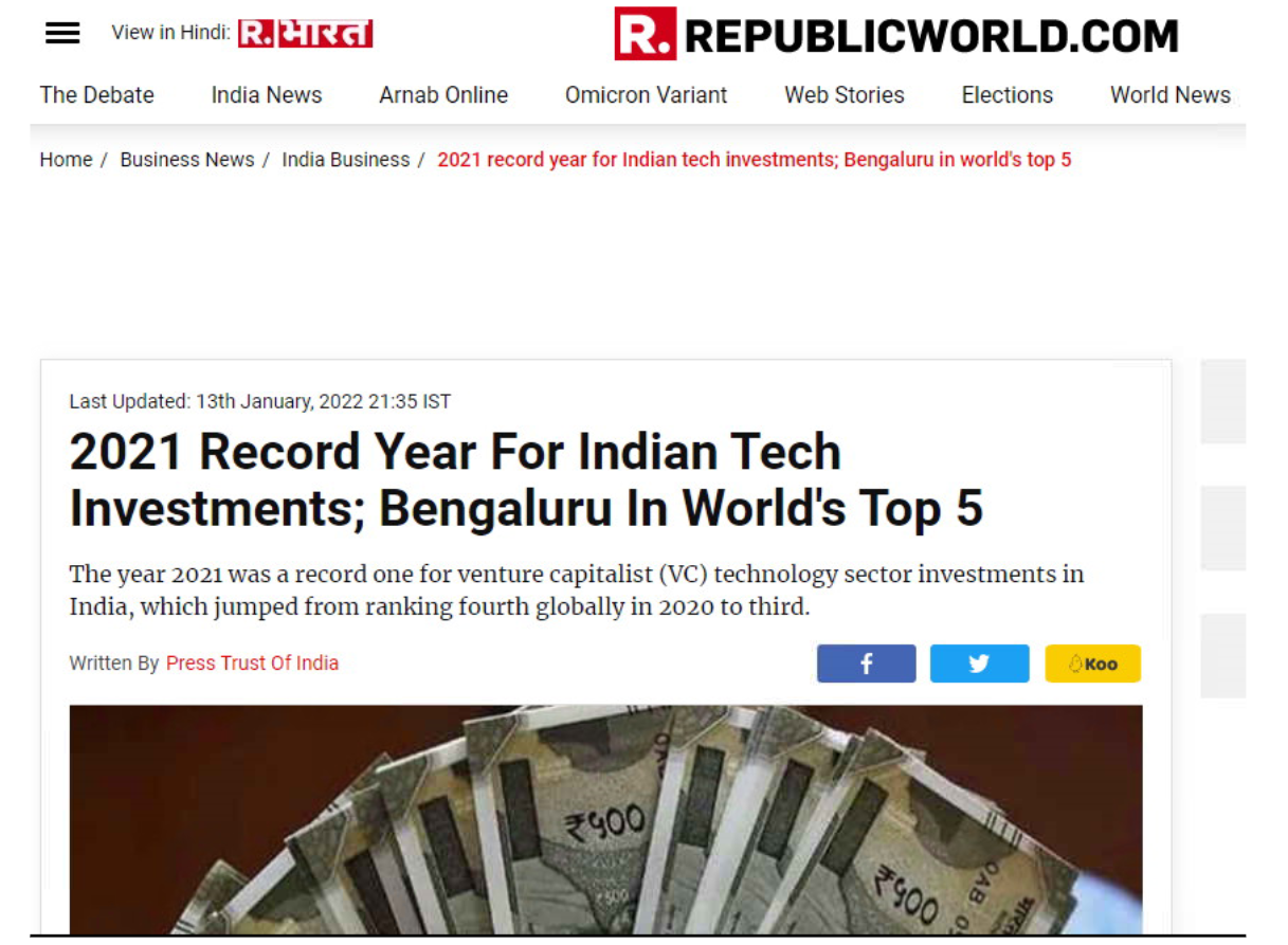 出典: https://www.republicworld.com/business-news/india-business/2021-record-year-for-indian-tech-investments-bengaluru-in-worlds-top-5-articleshow.html