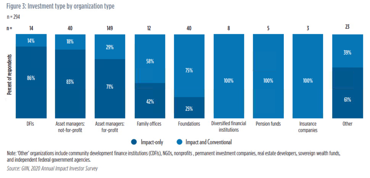 また、インパクト投資の資金の出し手がどの機関であるかについては下のグラフが参考になる。私が所属する生命保険会社や年金基金は、運用方針から鑑み、思考方法を取り入れる事は出来ても、リターンは高いがリスクも相当高いインパクト投資の主たる資金の出し手になるのは、現時点ではかなり困難かもしれない。