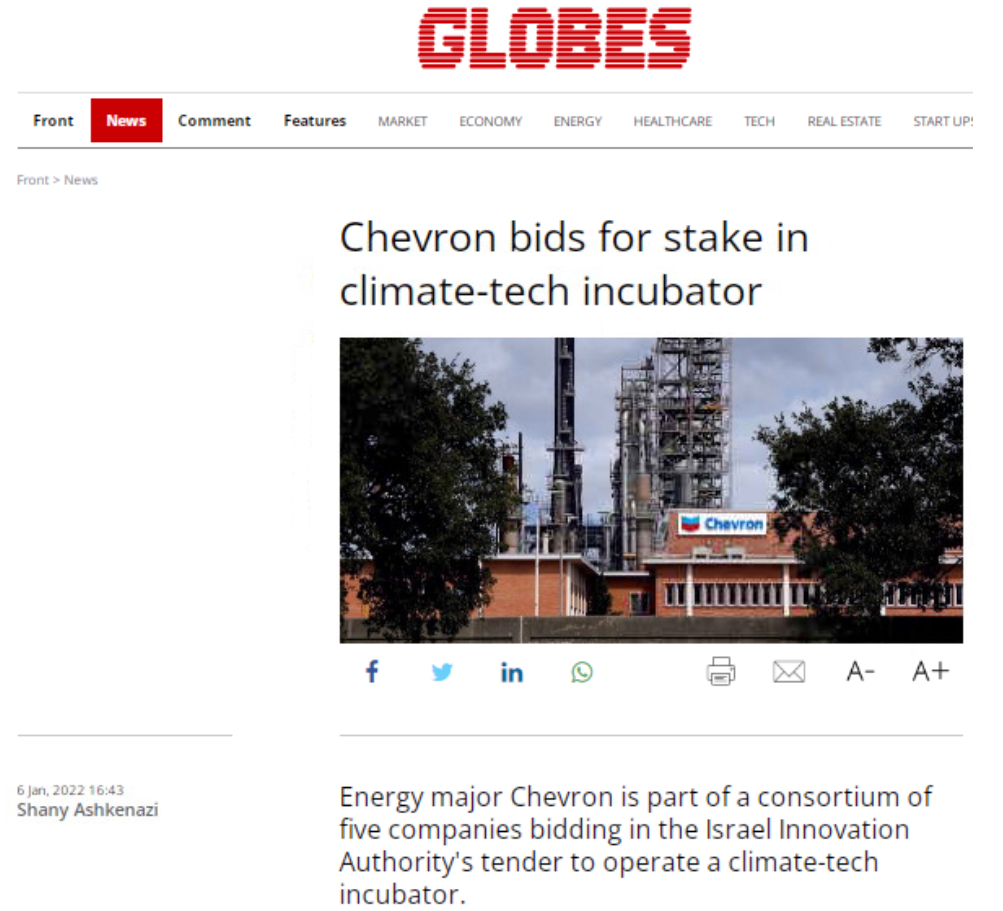 出典:https://en.globes.co.il/en/article-chevron-bids-for-stake-in-israels-climate-tech-incubator-1001397704