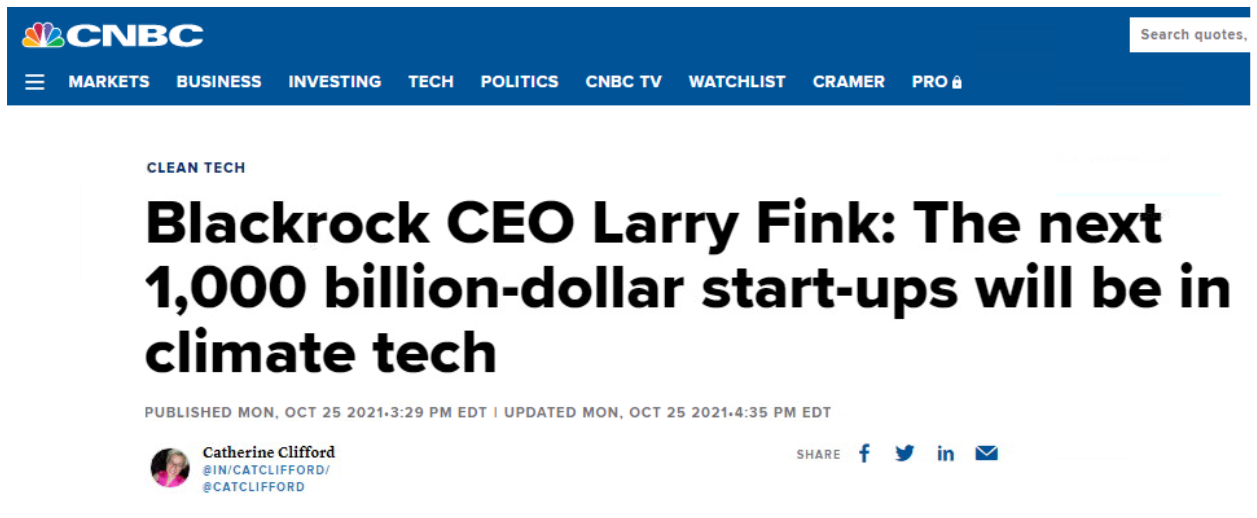 出典:https://www.cnbc.com/2021/10/25/blackrock-ceo-larry-fink-next-1000-unicorns-will-be-in-climate-tech.html