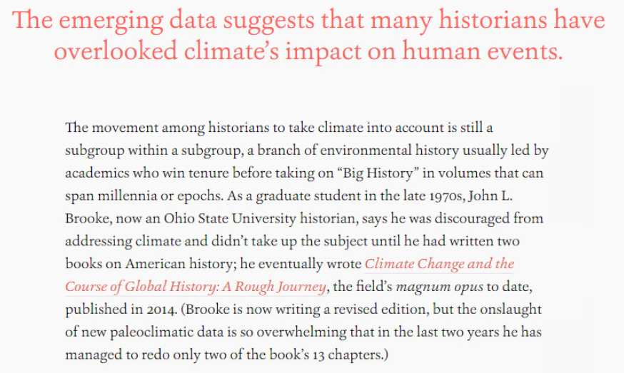もうひとつは、歴史学者が、最近の気候変動に関するデータに関心を持ち、気候が人間社会に与える影響を鑑み、これまでの歴史認識を変える話である。