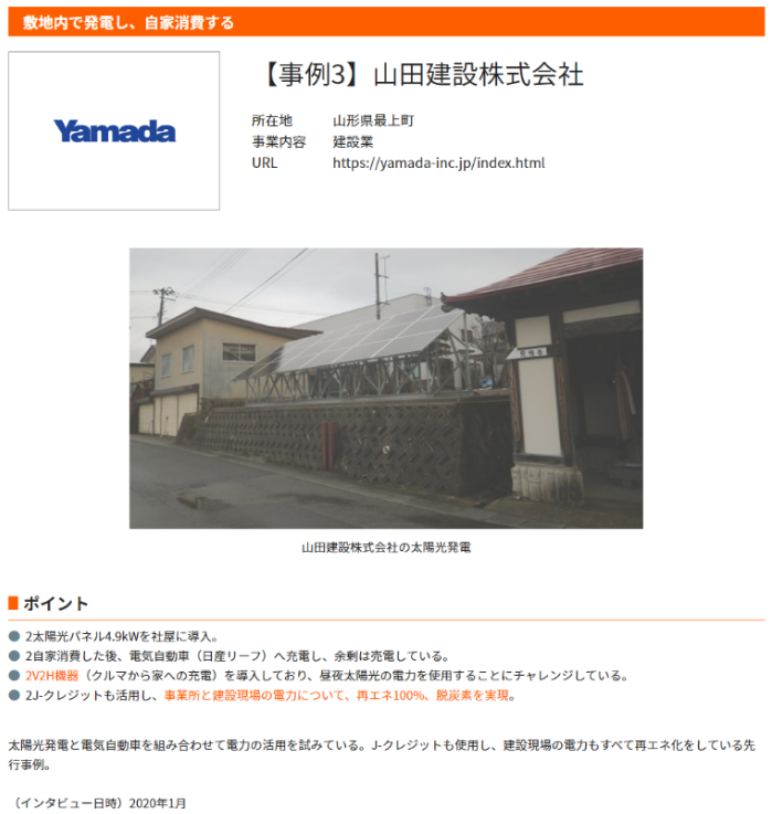 山形県最上町の建設会社「山田建設株式会社」は、再エネ100宣言に参加した2018年より自社の敷地内に設置した太陽光発電設備の電力を活用し、不足分の購入電力については再エネJ-クレジットを活用することで、再エネ100%を達成し続けています。