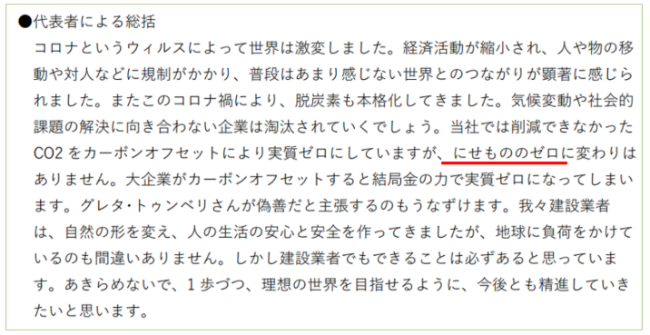 山田建設の山田社長は自社の環境活動レポートにおいて、クレジットの活用について「にせもののゼロ」と表現しています。お金でクレジットを購入することで脱炭素アクションや思考を終わらせず、実際のCO2排出量を削減することが理想である考えを公に伝え課題意識を共有することもカーボン・オフセットの実施において大切な表現だと思います。