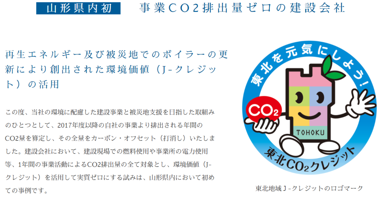また、再エネ100宣言の目標範囲外の化石燃料の消費によるCO2排出量についても、省エネ系J-クレジット等を用いることでカーボン・オフセットし、Scope1,2の排出量をゼロカーボンとする県内初の建設会社として、東北経済産業局からの表彰やメディアへの掲載など話題を集めてきました。
