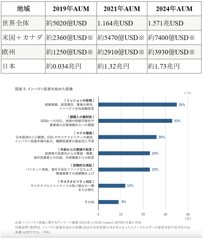インパクトファイナンスの市場規模は、2010年代半ばから爆発的に拡大しています。GIIN(Global Impact Investing Network)の推計では、2015年時点で約1,350億USDだった世界全体のインパクト投資運用資産(AUM)は、2024年には約1.57兆USDまで成長し、この10年で、ほぼ10倍という驚異的な伸びを示しています。