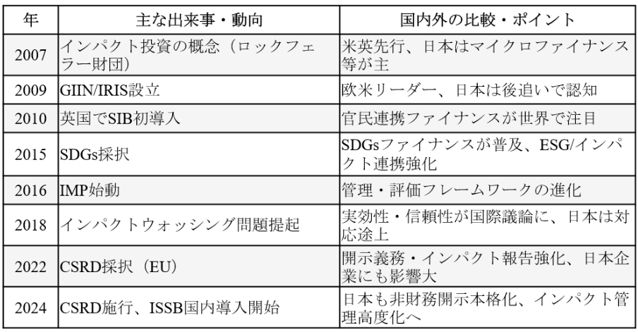 2010年代に入ると、英国政府がSocial Impact Bond(SIB)という成果連動型ファイナンスを導入し、投資による社会的インセンティブの仕組み化を推進。米国でもメロン財団、フォード財団、ゲイツ財団といった巨大ファミリーオフィス・財団が「システムチェンジ=社会構造そのものを変革するための投資」に多額の資金を投下し、インパクト評価指標(IRIS+等)の標準化も進展し、インパクトファイナンスが広がって行きました。