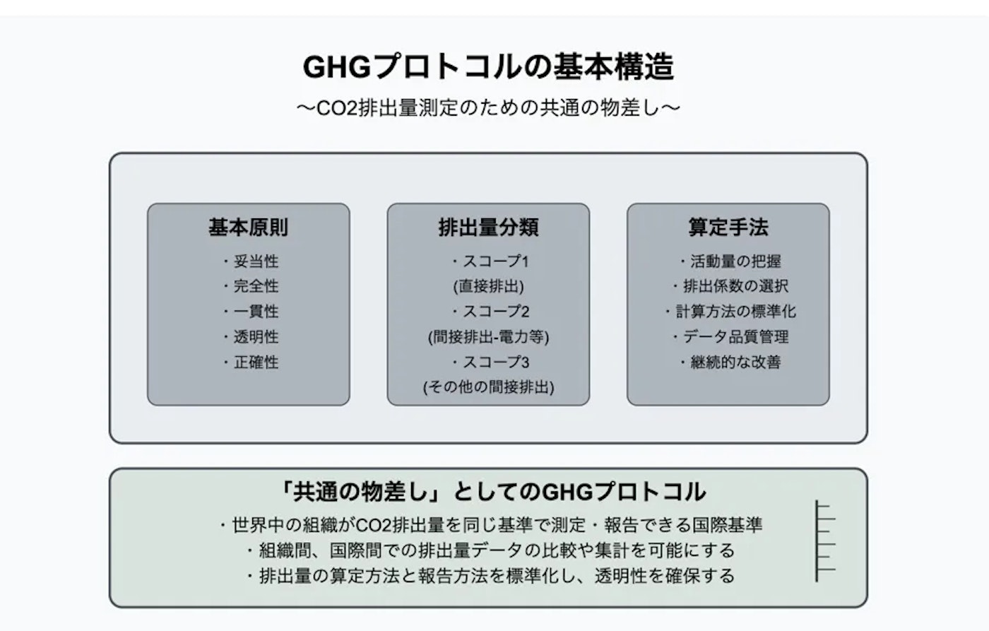 簡単に言えば、「CO2を測るものさし」です。「GHG」とは「Greenhouse Gas(温室効果ガス)」の略称です。CO2だけでなく、メタンや一酸化二窒素などの温室効果ガス全般を含みますが、本記事ではわかりやすさのためにCO2と表現しています。